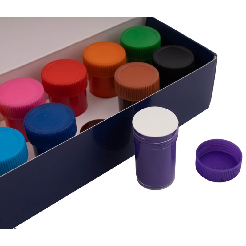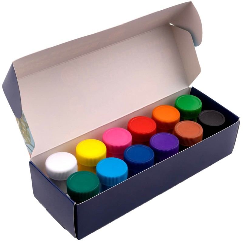 Opakowanie zawiera 12 słoiczków, w każdym inny kolor farby o pojemności 20 ml każdy.