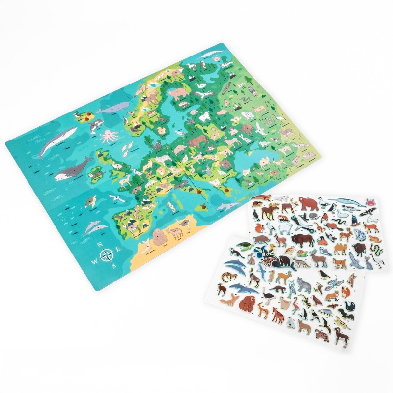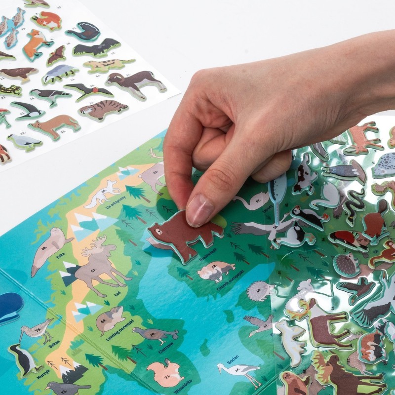 • Zestaw zawiera naklejki ze zwierzętami, które można umieszczać na mapie zgodnie z oznaczeniami, aby zobrazować ich naturalne środowiska.