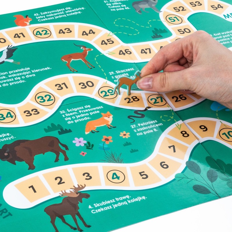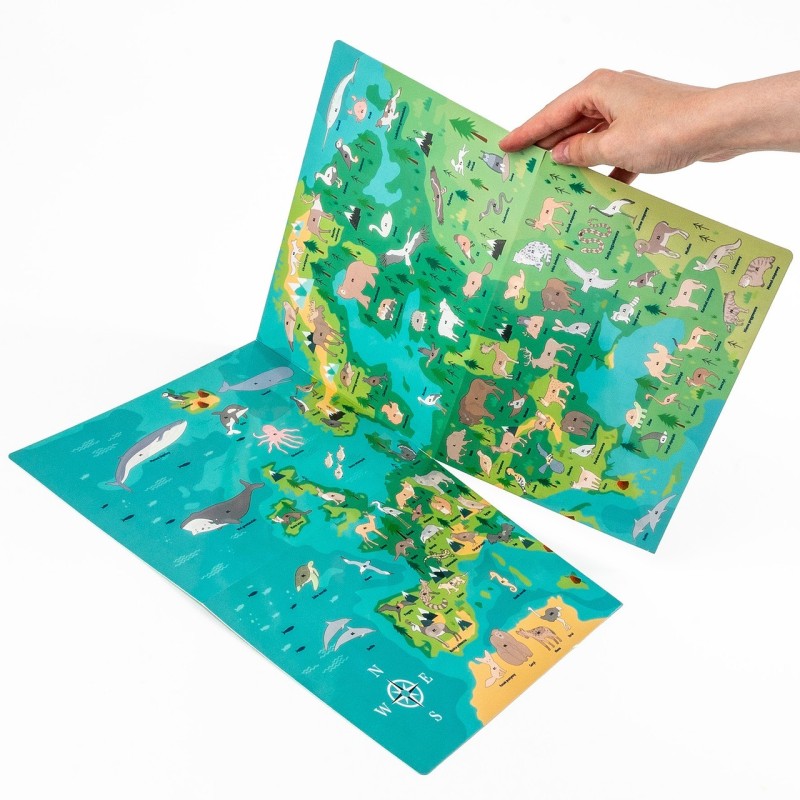 Niezwykła zabawa rozwija jednocześnie wiedzę geograficzną i biologiczną. Dodatkowo, na odwrocie mapy czeka niespodzianka – wciągająca gra planszowa.