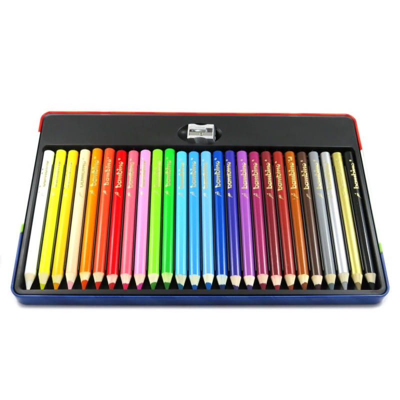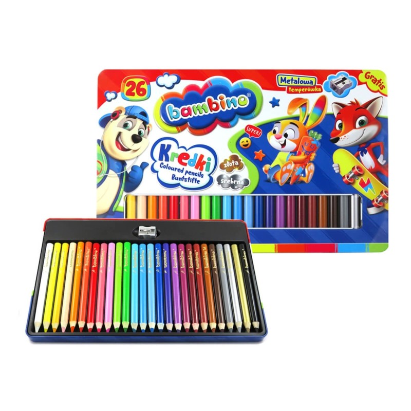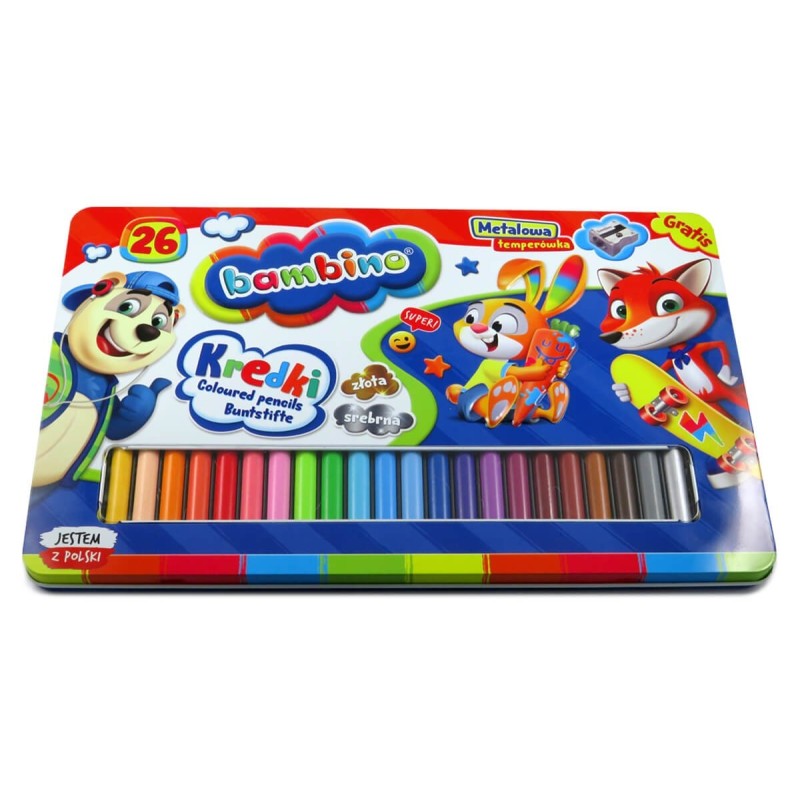 Kredki w oprawie drewnianej renomowanej Polskiej marki Bambino. W opakowaniu znajduję się 26 kredek o różnych, intensywnych kolorach. Do kredek został dołączony gratis - metalowa temperówka.