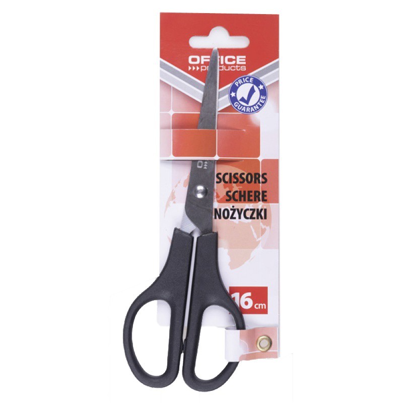Nożyczki biurowe OFFICE PRODUCTS o długości 16 cm z ergonomicznym uchwytem i satynowymi ostrzami ze stali nierdzewnej. Uniwersalne – idealne do papieru, kartonu i zdjęć. Kolor czarny.