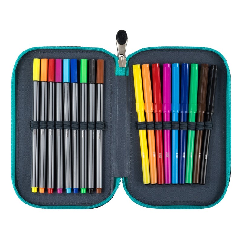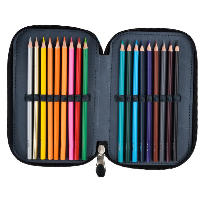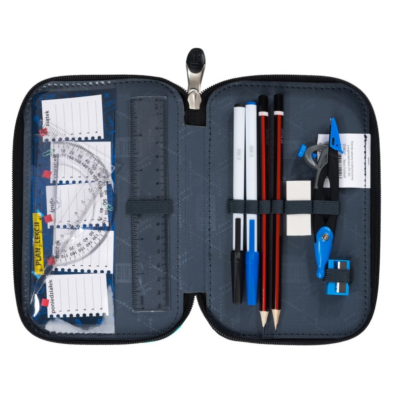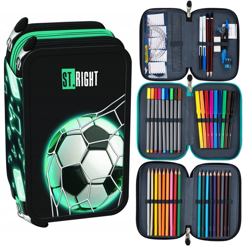 Piórnik posiada zamki błyskawiczne z wygodnymi zakończeniami. Komory piórnika posiadają gumowe uchwyty na akcesoria szkolne - wewnątrz pełne wyposażenie marki St.Right.