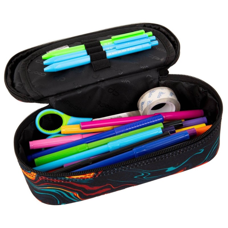 Wewnątrz piórnika jest wolna przestrzeń, która pomieści dużo przyborów piśmiennych. Dodatkowo znajduje się w nim klapka z uchwytami z gumy na długopisy (10 miejsc).