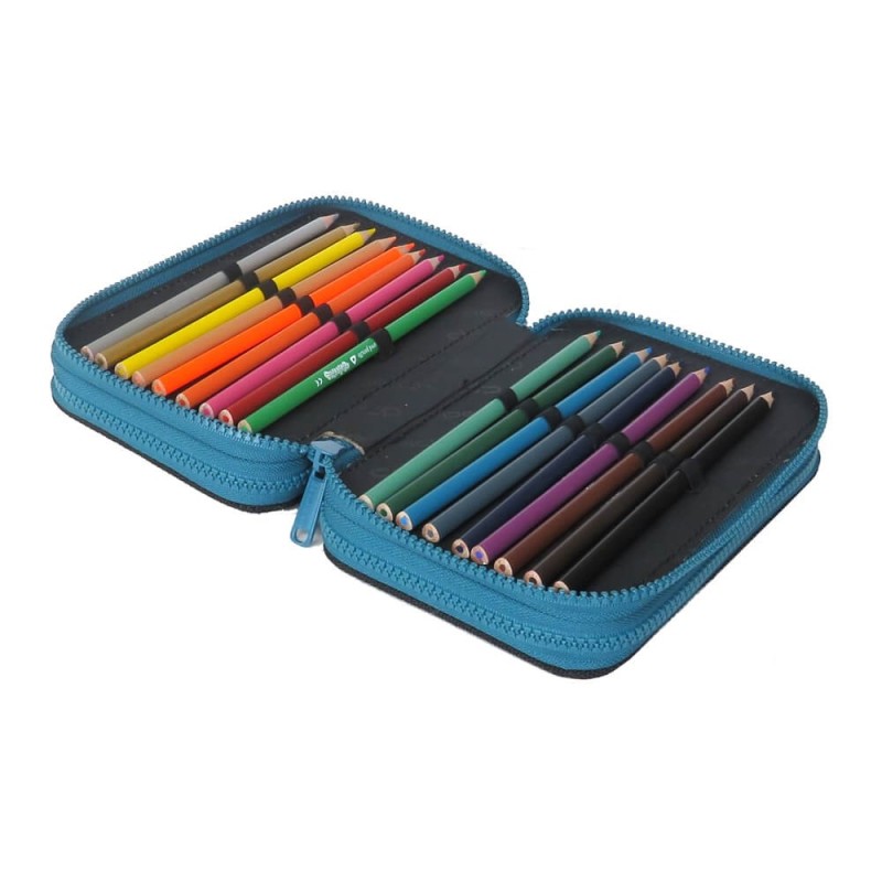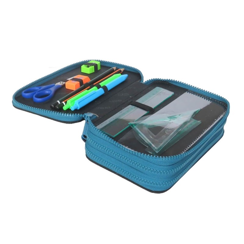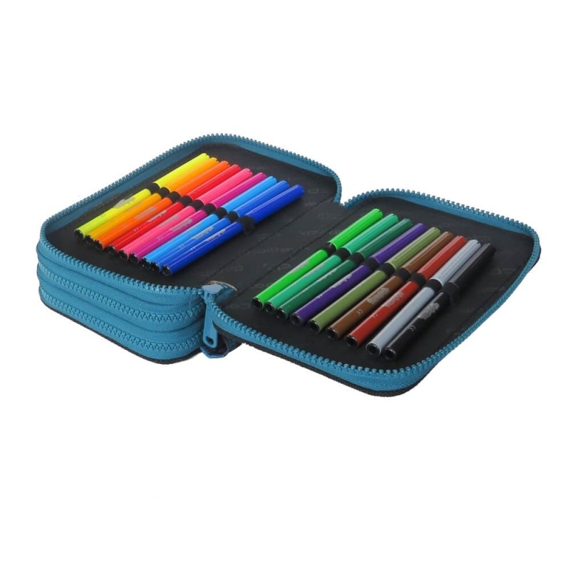 Komory piórnika posiadają gumowe uchwyty na akcesoria szkolne - wewnątrz pełne wyposażenie marki Colorino.