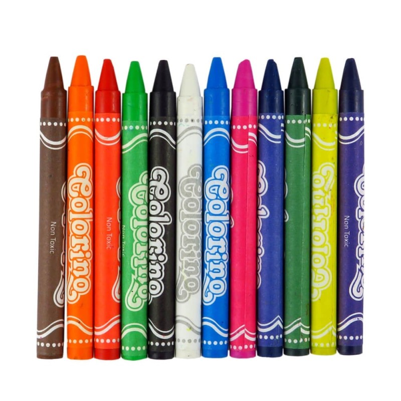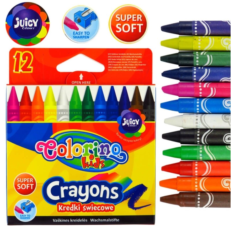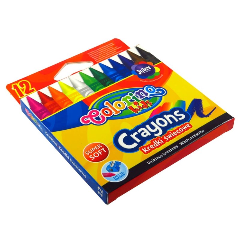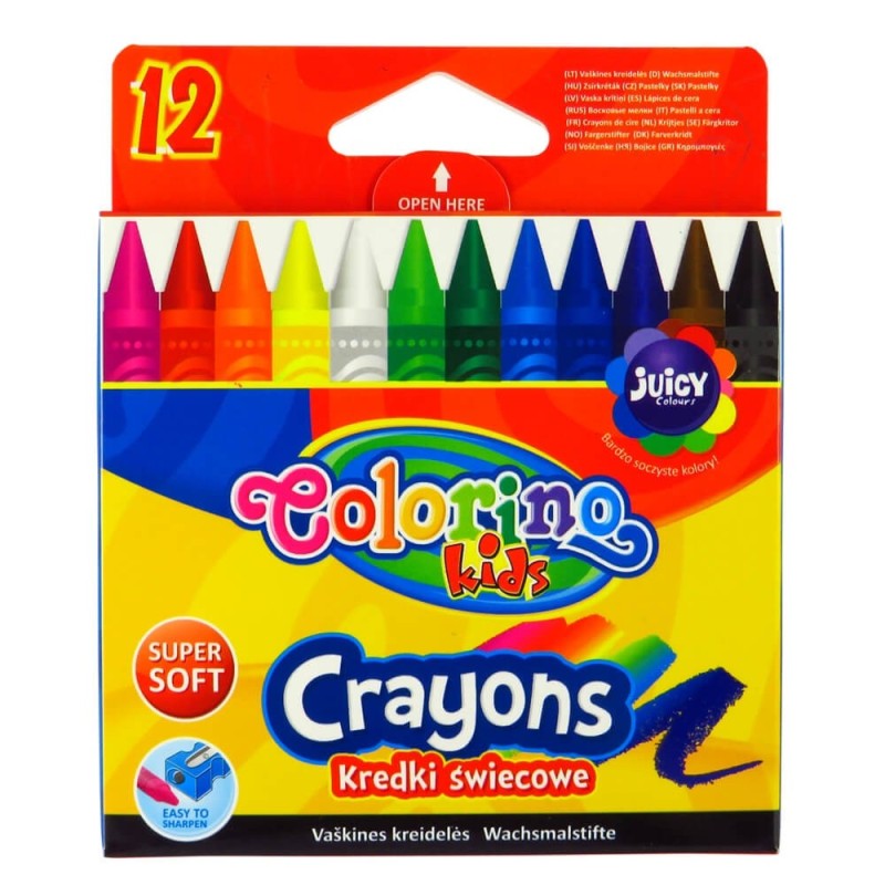 Kredki świecowe firmy Colorino. Opakowanie zawiera 12 kredek. Kredki te są odporne na złamania, nie kruszą się i nie pylą. Nie wymagają temperowania.Poręczne, niewielkie opakowanie.
