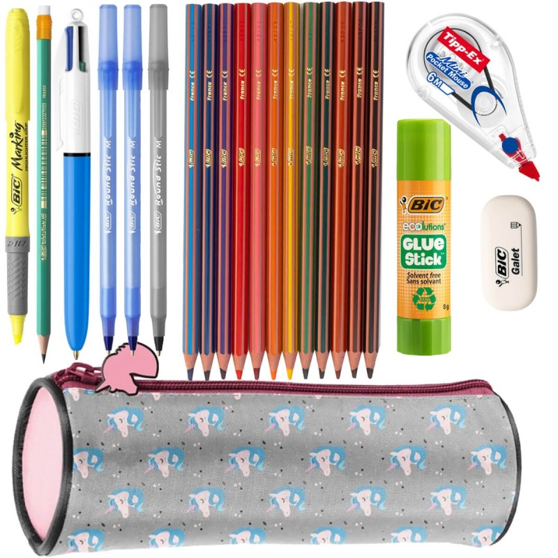 Stylowy piórnik Paso Horses wyposażony w komplet markowych artykułów piśmienniczych BIC: kredki, długopisy, zakreślacz, ołówek, korektor, klej i gumkę. Idealny zestaw do szkoły.