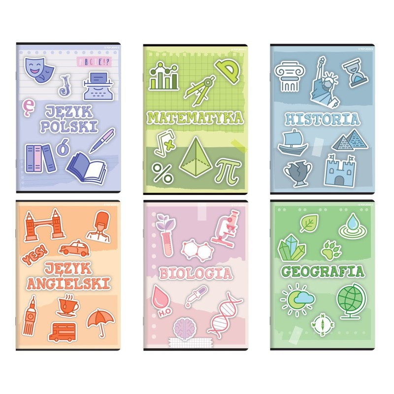 Zestaw 6 zeszytów przedmiotowych A5 dla klas 5-6. W skład zestawu wchodzą następujące zeszyty: