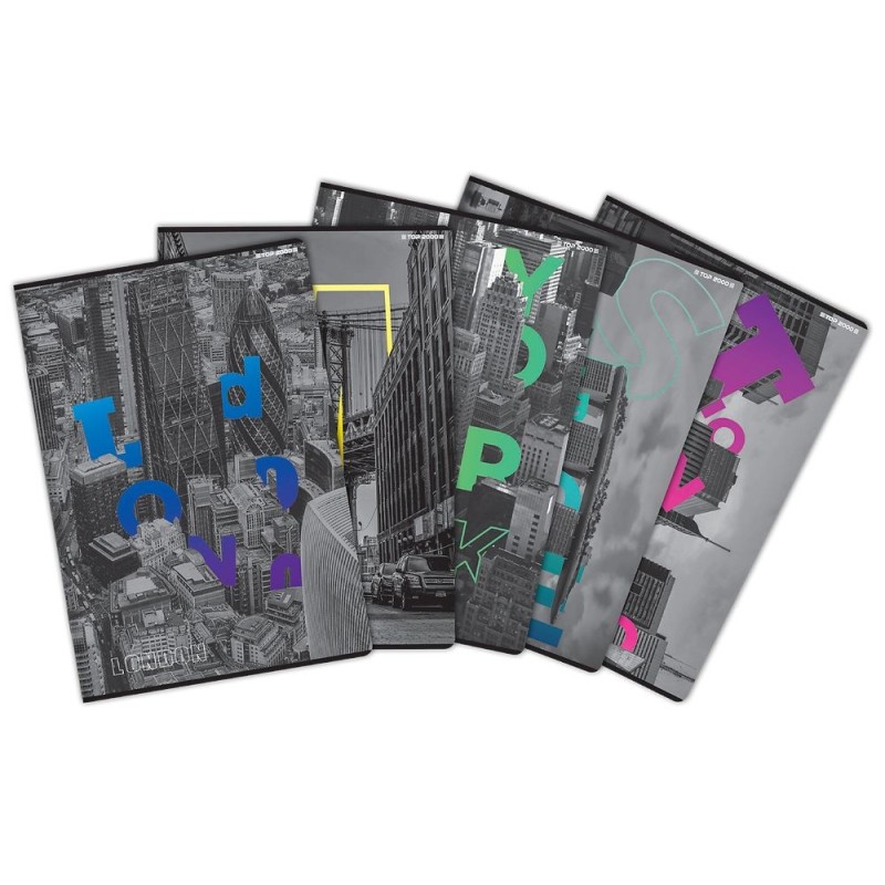Kolekcja 5 unikalnych zeszytów Top 2000 City przedstawiających niezwykłe ujęcie miast! Eksploruj swoją wyobraźnię podczas szkolnych lekcji i notuj w stylowy sposób przy użyciu naszych zeszytów, które są nie tylko praktycznym, ale także artystycznym i modowym dodatkiem!