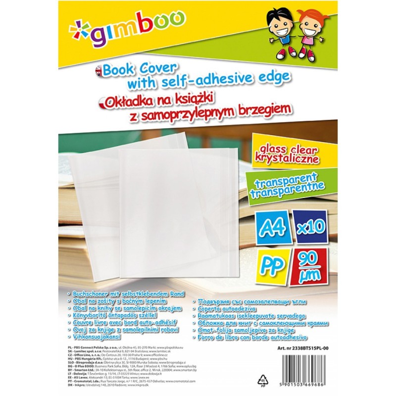 Samoprzylepne brzegi ułatwiają szybkie i wygodne obłożenie książki bez potrzeby dodatkowego mocowania. Przezroczysty materiał nie zasłania oryginalnej okładki, dzięki czemu książka zachowuje estetyczny wygląd i pozostaje łatwa do rozpoznania. Produkt sprzedawany jest w arkuszach, w opakowaniu 10 sztuk.
