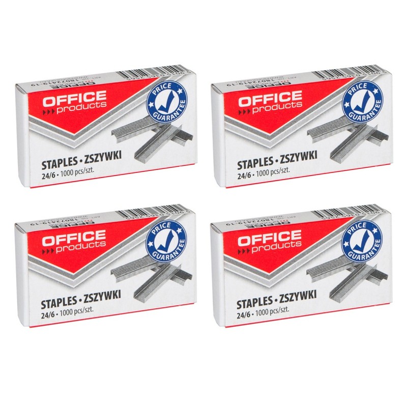 Metalowe, ocynkowane zszywki marki Office Products w rozmiarze 24/6, w opakowaniu zawierającym 1000 sztuk — idealne do codziennego użytku biurowego, szkolnego i domowego. Zestaw 4 opakowań